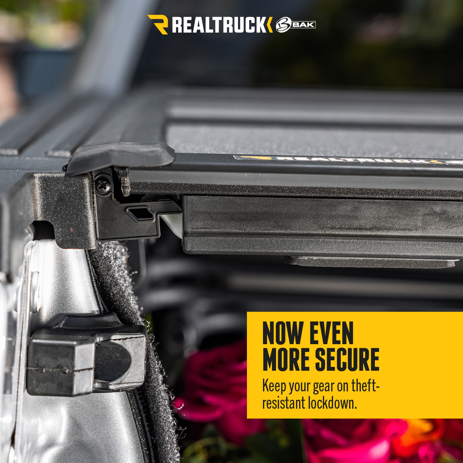 The best-selling truck bed cover in the world just got better.Introducing the new and improved RealTruck BAKFlip® MX4 (GEN 3)—an evolution of RealTruck’s most popular tonneau cover. This next-generation upgrade builds on everything truck owners already love about MX4, now enhanced with improved functionality, greater durability, and elevated security.The new and improved BAKFlip MX4 is constructed primarily from alloy materials, including heavy-duty aluminum top panels and side rails. Reinforced with high-density polymer cores, each panel delivers a 22 percent increase in overall strength compared to the original model.Security is also enhanced. In addition to BAK’s patented auto-latching system, which automatically secures the cover when closed, the BAKFlip MX4 (GEN 3) features re-engineered lock components for improved resistance to forced entry compared to the GEN 2. No matter the cargo you’re transporting, you can rest assured knowing your gear’s protected.When the weather turns, the BAKFlip MX4 (GEN 3) holds strong. Revised EPDM rubber perimeter seals and tight-fit clamps provide our best seal yet, preventing seepage between the bed cover and bed rails. At the rear of the cover, a 13 percent longer dual-action tailgate seal provides weather protection for the tailgate. This innovative design also improves operation, maintaining factory tailgate functionality regardless of the cover’s position.The BAKFlip MX4 isn’t only durable, it’s also sleek and stylish. Unlike competitors, the BAKFlip MX4 sits flush with your pickup’s bed rails, practically disappearing into your truck’s profile. And with a sleek, textured matte black finish across all surfaces, the MX4 looks great whether open or closed.
