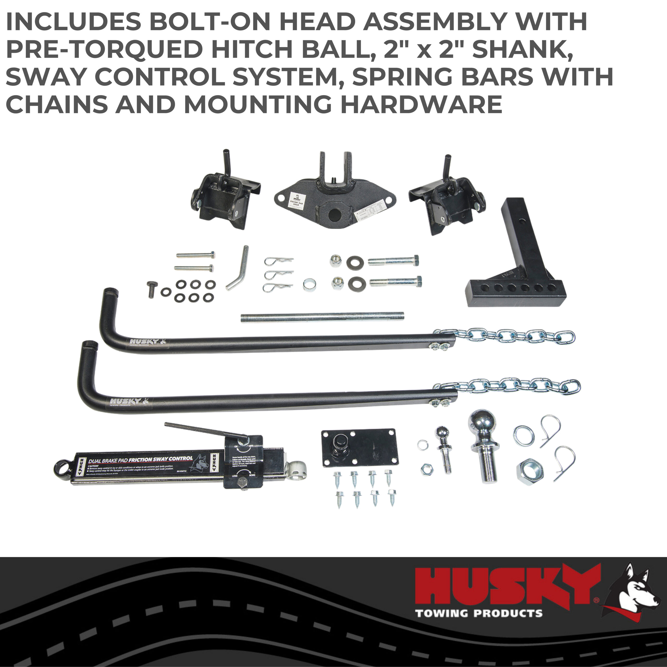 Husky?s Round Bar weight distribution hitch gets the job done with a classic design with the addition of some great design features. The head design provides for reduced installation time and allows easy access to the hitch ball shank. A sway control ball