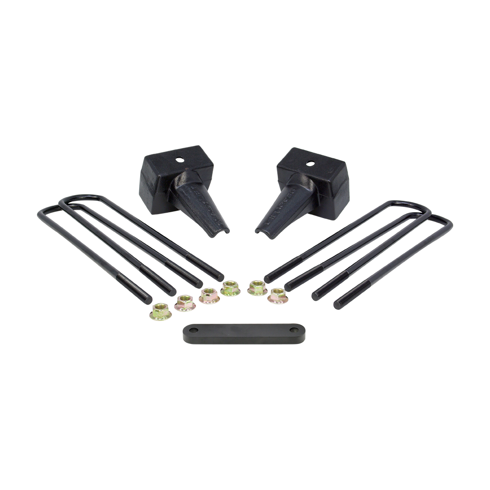 ReadyLIFT OEM-style rear block kits are available for model specific applications. These Rear Block Kits include two (2) 5″ Rear Blocks, four (4) E-Coated U-Bolts, eight (8) Nuts and Washers and will safely lift the rear of your 1999-2010 Ford Super Duty 2WD/4WD Truck with a two-piece driveshaft. Based on OEM designs and never made out of light weight extrusions our 66-2295 5.0″ Ford Super Duty Blocks have Integrated OEM Style Bump Stops. ReadyLIFT Block Kits will put a slight rake back in your truck for hauling or towing and are designed to work in concert with your ReadyLIFT Suspension Leveling Kit. In fact, these blocks are the ideal Tow Package upgrade for not only for stock height vehicles but lifted or leveled trucks too! Like all ReadyLIFT products, these block kits come with our Limited Lifetime Warranty. NOTE: The lift blocks in this kit are not designed to work with aftermarket or factory add-on air spring/load leveling kits that attach to the bump stop tangs. Use of this type of air bag system will void all block warranties and can cause failure of the block bump stop tang.