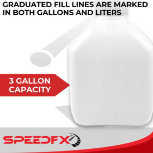 SpeedFX 3 Gallon Utility Jugs are packed with value added features that make them the go-to solution for performance enthusiasts. Manufactured from virgin high density polyethylene, these high quality jugs have an ergonomic contoured handle and with easy grip bottom for stability when pouring. Graduated fill lines are marked in both gallons and liters. And these jugs come complete and ready to use with a non-breakable multipurpose cap, rubber gasket, filler hose and vent – no other parts required. Buy confidently knowing that each SpeedFX Utility Jug is required to pass a rigorous 15 point inspection to ensure worry-free performance.