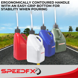 SpeedFX 5 Gallon Utility Jugs are packed with value added features that make them the go-to solution for performance enthusiasts. Manufactured from virgin high density polyethylene, these high quality jugs have an ergonomic contoured handle and with easy grip bottom for stability when pouring. Graduated fill lines are marked in both gallons and liters. And these jugs come complete and ready to use with a non-breakable multipurpose cap, rubber gasket, filler hose and vent – no other parts required. Buy confidently knowing that each SpeedFX Utility Jug is required to pass a rigorous 15 point inspection to ensure worry-free performance.