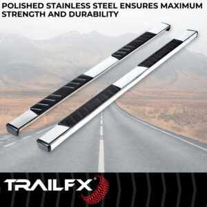 Trapezoid side steps are constructed of high quality, mirror finished T-304 stainless steel and matte black stainless steel.