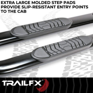 TrailFX Step Bars maximize style and safety when entering and exiting your vehicle. Available in various sizes, shapes, and finishes, TrailFX steps offer a solution for every need. Each pair installs seamlessly against the vehicle’s contours for a sleek and stylish look. With TrailFX step products, a custom look doesn’t have to break the bank.