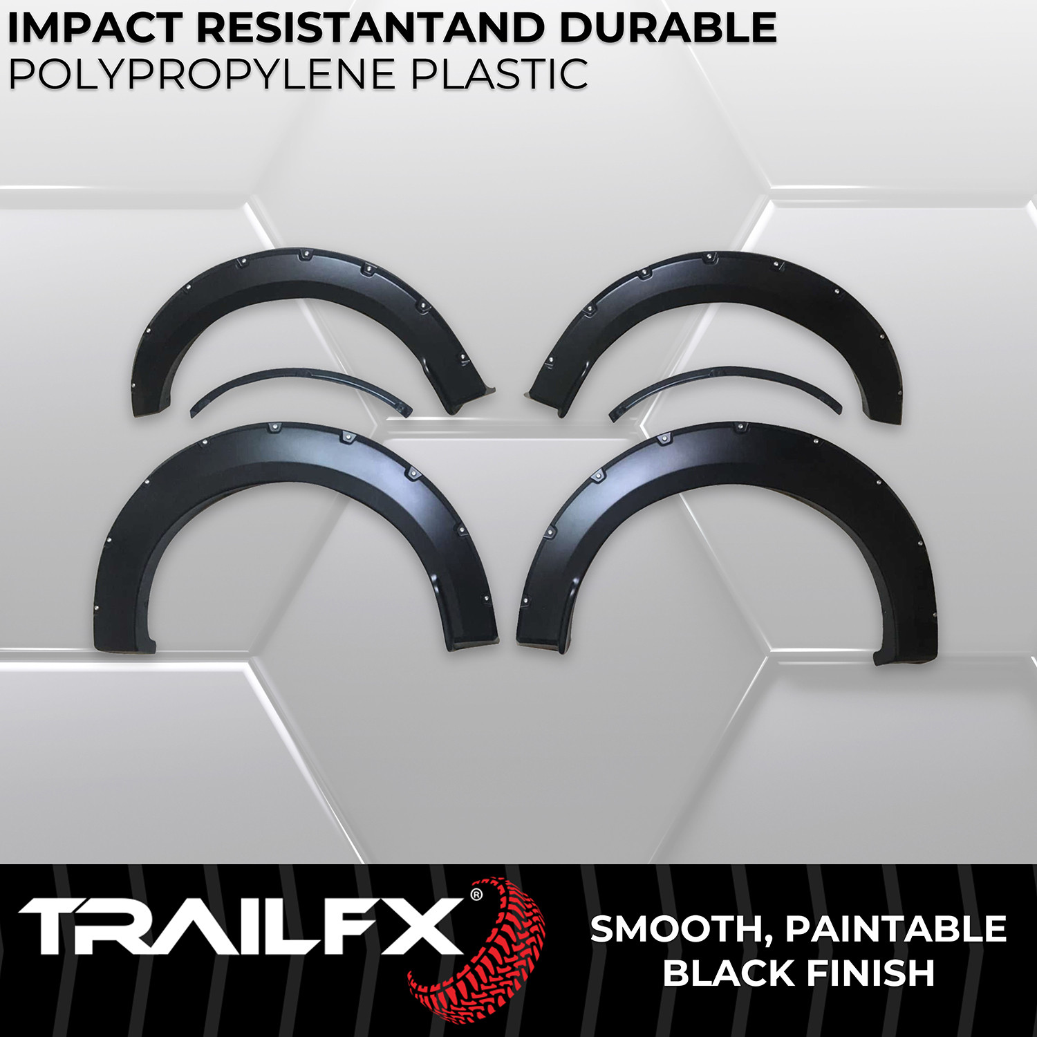 Create that custom, assertive, off-road look you want while protecting your paint from rocks and road debris with TrailFX Pocket Style Fender Flares. These flares are manufactured from durable, impact resistant polypropylene, are 100 Percent UV resistant to prevent cracking and fading, and are available in a smooth paintable finish. TrailFX Flares provide additional tire coverage that spotlights larger wheel and tire packages. Unlike other brands, TrailFX Fender Flares include BOTH polished stainless steel and black steel rivets to choose from with stainless steel jam nuts, allowing you to create a custom appearance that matches the style of your vehicle.