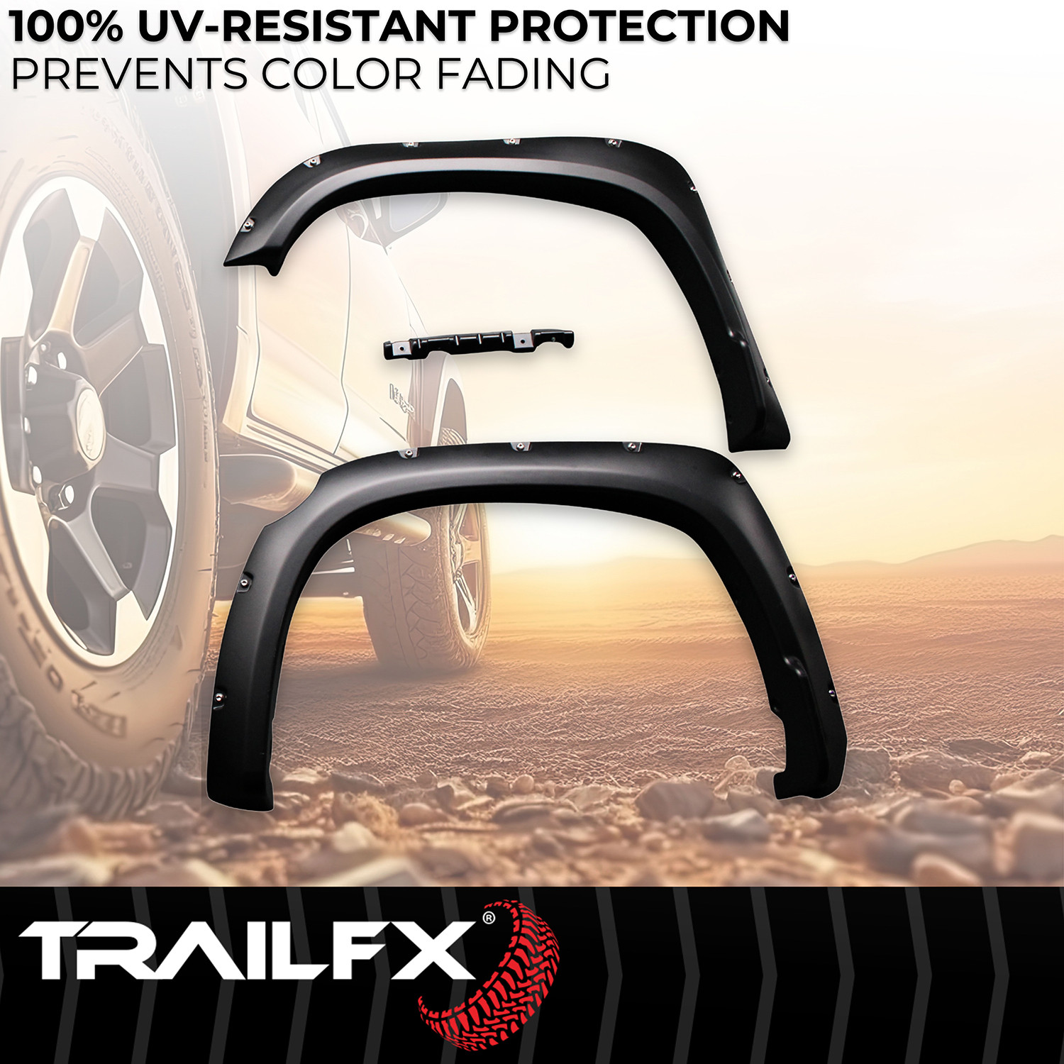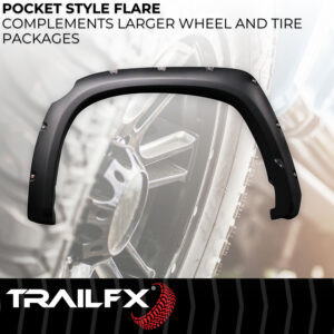 Create that custom, assertive, off-road look you want while protecting your paint from rocks and road debris with TrailFX Pocket Style Fender Flares. These flares are manufactured from durable, impact resistant polypropylene, are 100 Percent UV resistant to prevent cracking and fading, and are available in a smooth paintable finish. TrailFX Flares provide additional tire coverage that spotlights larger wheel and tire packages. Unlike other brands, TrailFX Fender Flares include BOTH polished stainless steel and black steel rivets to choose from with stainless steel jam nuts, allowing you to create a custom appearance that matches the style of your vehicle.
